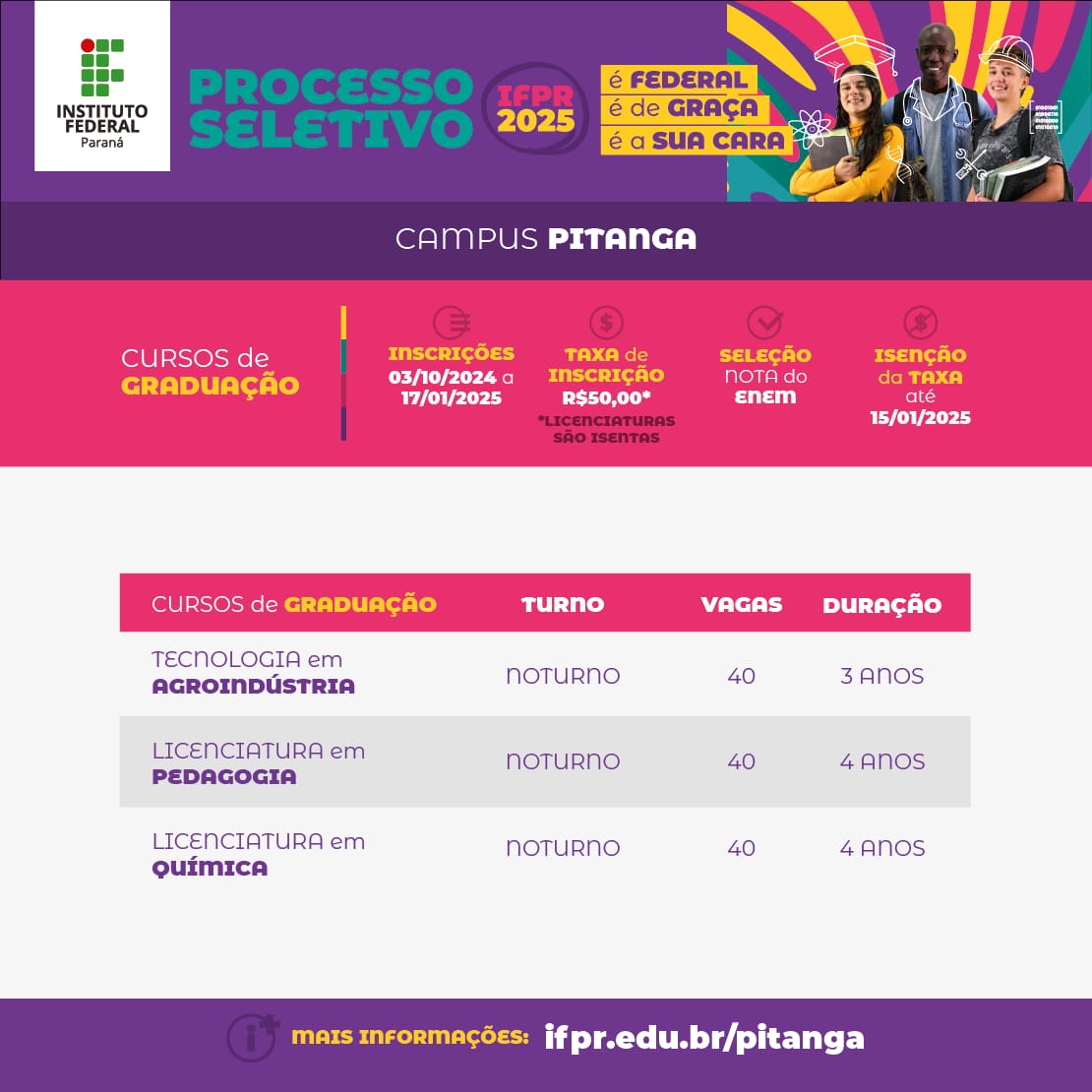 Cursos técnicos integrados e subsequentes ao ensino médio.