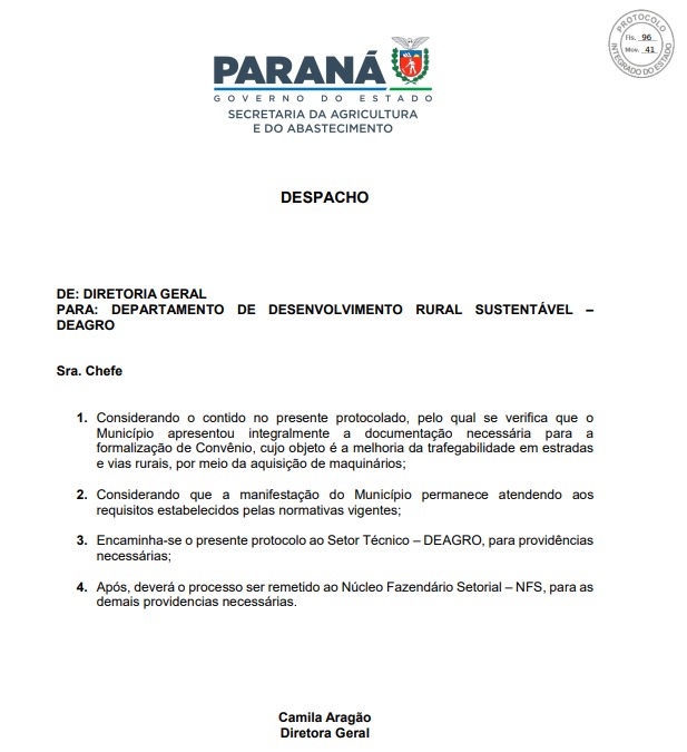 O município de Santa Maria do Oeste - PR, por meio da Secretaria de Municipal de Planejamento, cumpriu a determinação do prefeito municipal Oscar Delgado e protocolou no ultimo dia 13 de maio de 2025, o processo de aproximadamente 96 Páginas, o qual permite ao Município o acesso a convênio com o Governo do Estado do Paraná, por meio da SEAB, no valor de R$3.700.000,00 (Três Milhões e Setecentos mil reais) Somando a contrapartida financeira do Município, o convenio vai proporcionar a aquisição de um total de 5 (cinco) unidades de máquinas/equipamentos rodoviários de grande porte. O processo agora segue em tramitação na SEAB - SEAB/DEAGRO, para as demais providencias.